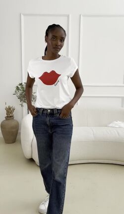 A classic with a side of chic, our neat fit white T Shirt features our red lip print design and Bisous handwriting to add a touch of joy to your everyday look. Also available in a navy sweatshirt.