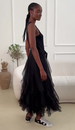 The Iris tulle skirt is crafted from 100% recycled materials and features a romantic waterfall drape with masses of fabric for added movement. She's shaped to sit flat against the hips for a flattering fit. The waist is elasticated for the comfort and she comes with three interchangeable and removable ribbons to wear your way. The Iris Tulle Skirt is made ultra comfortable to wear with a recycled silky-feel underskirt.